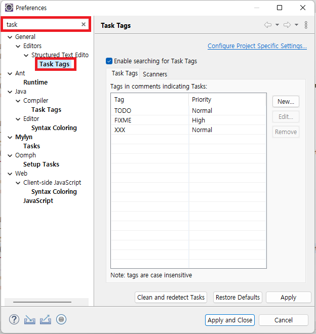 상단 검색에 task 입력 - General - Editors - Task Tags