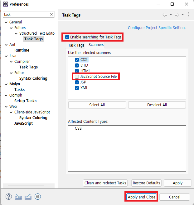Enable searching for Task Tags 체크 - Scanners - JavaScript Source File 체크 해제