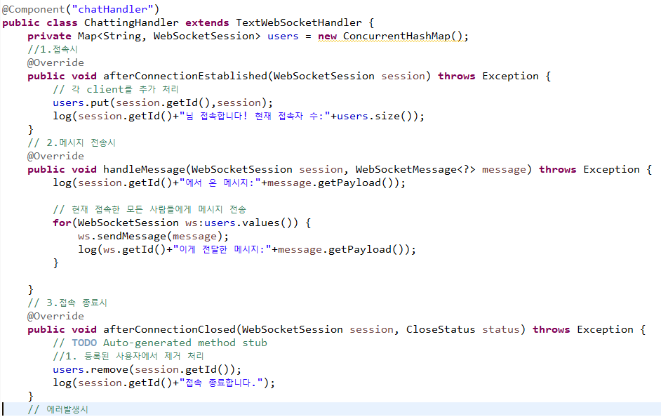 public class ChattingHandler extends TextWebSocketHandler {
