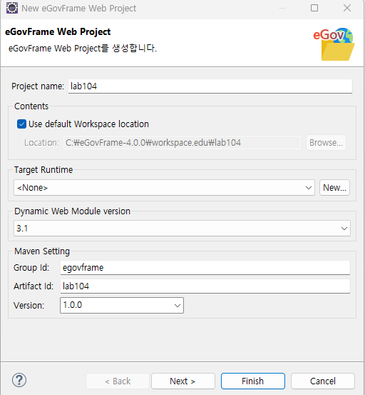 Eclipse Menu > eGovFrame > Start > New Web Project 선택