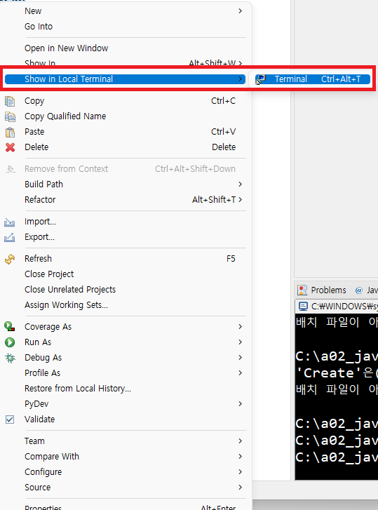 만들어진 프로젝트 오른쪽 마우스 클릭 - Show in Local Terminal - Terminal